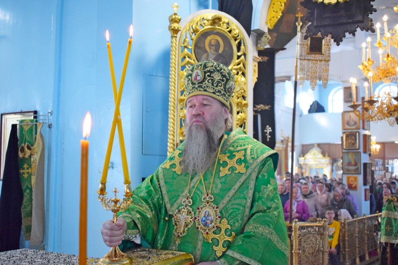 Накануне вечером Его Преосвященство совершил Всенощное бдение в храме святителя Николая г. Канаш. По пении 50 -го псалма во время богослужения было совершено традиционное освящение ветвей верб.