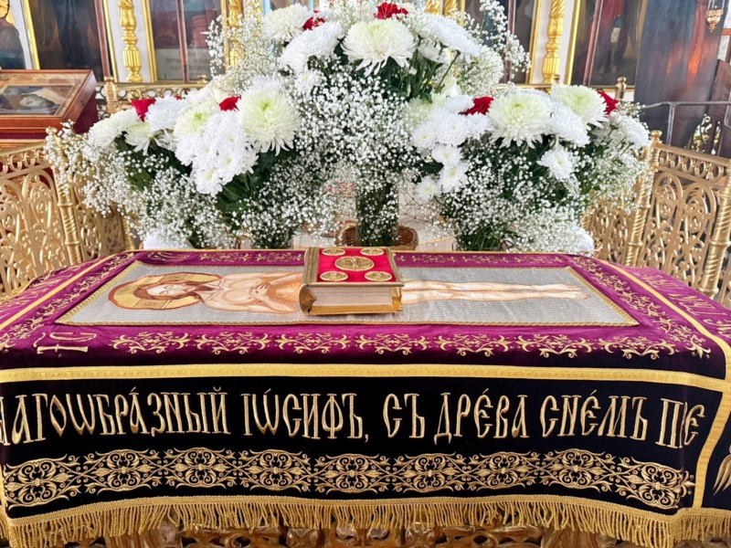 Во время пения тропаря «Благообразный Иосиф…» Святая Плащаница была изнесена духовенством из алтаря на середину храма.