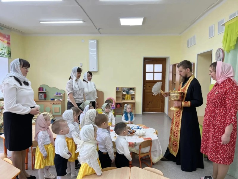 Воспитанники детского сада, в свою очередь, приготовили для гостей небольшой концерт: читали стихи, показали небольшую сценку и пели песни, посвящённые Пасхе. В завершение встречи батюшка зашёл в каждую группу, чтобы благословить детей, их наставников и все уголки деткого сада.