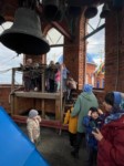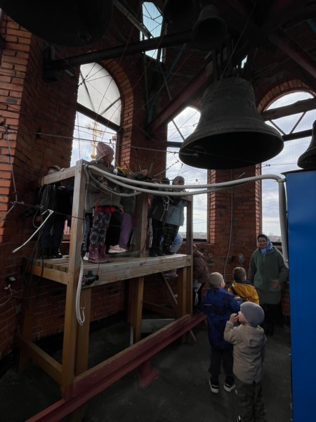 Дети с восхищением осмотрели убранство храма, побывали на хорах, а затем поднялись на колокольню. Под руководством батюшки они рассмотрели колокола и поочерёдно ударили в них — торжественный звон разнёсся по округе, а малыши сияли от счастья.