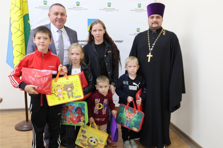 Глава округа Н.Н. Раськин и благочинный III Комсомольского муниципального округа настоятель храма Вознесения Господня с. Комсомольское иерей Сергий Скворцов, совместно вручили канцелярские принадлежности детям из многодетных и малообеспеченных семей.
