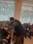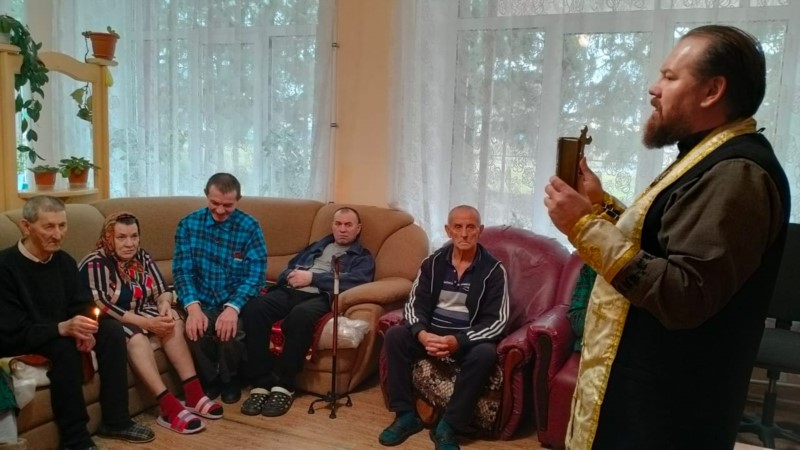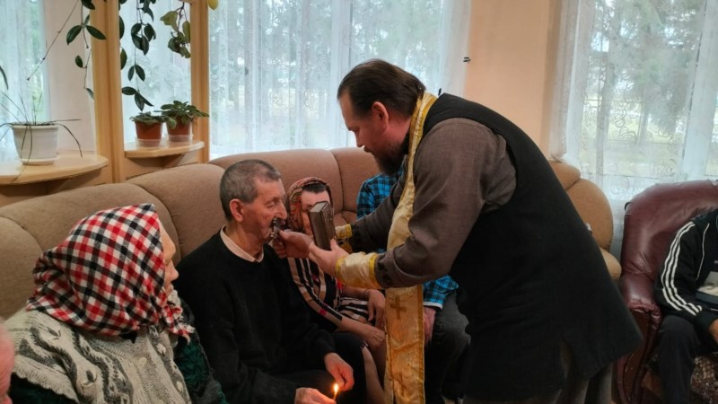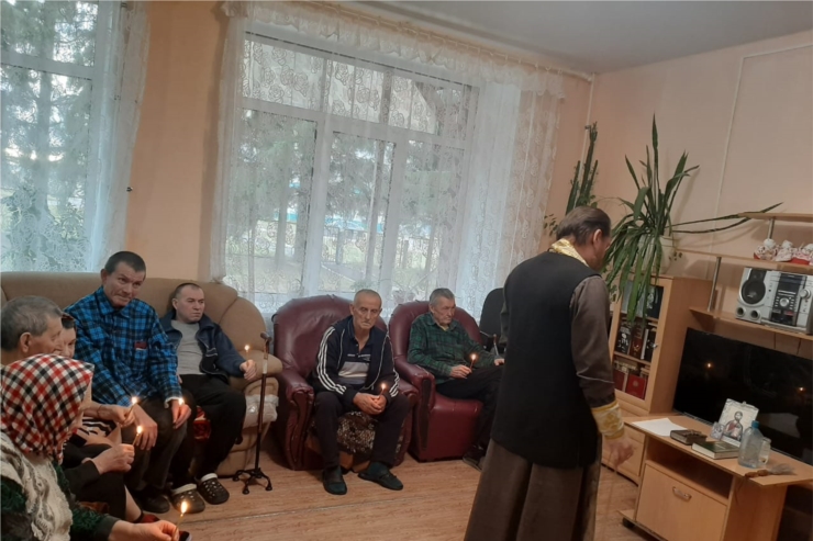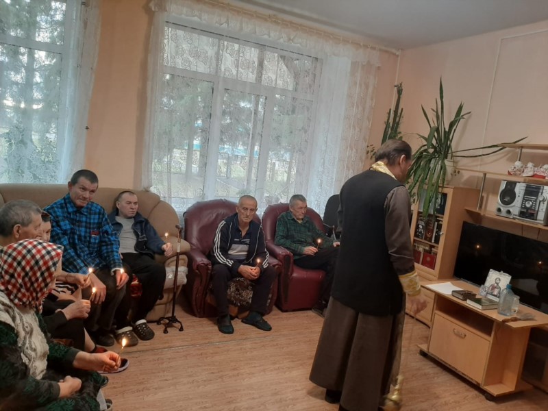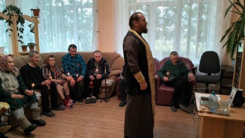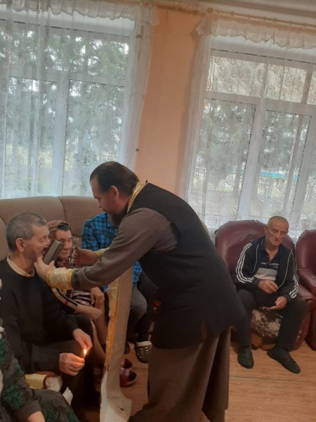 Также иерей Николай привёз подарки от прихожан Тюрлеминской и Карамышевской церквей- памперсы и тёплые носки. В проповеди иерей Николай рассказал о том как важно в почтенном возрасте очистить совесть и примериться с Богом.