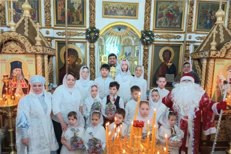 7 января 2026 года, в храме Вознесения Господня села Комсомольское Комсомольского муниципального округа в честь Рождества Христова прихожан поздравили Дед Мороз и Снегурочка.